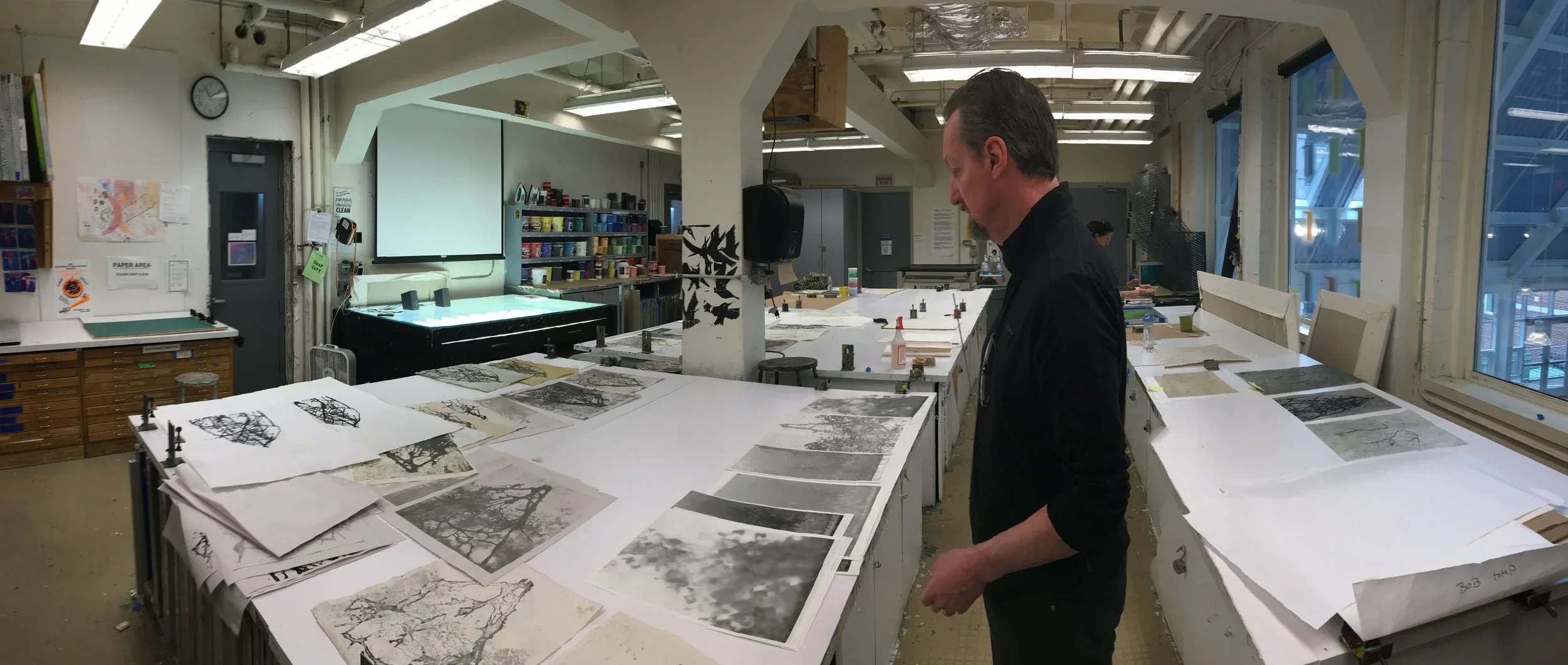 I spent early April in Massachusetts. First was a week-long stint at the School of the Museum of Fine Arts in Boston. Here I worked with faculty members making images combining digital prints, laser engraved woodblocks and lithography plus a variety of techniques including paper dyeing, charcoal and shellac. Massive thanks to John Schulz for organizing the gig. Also thanks to Michelle Samour and her paper making class who made some beautiful Kozo paper for me. And thanks to master printer Carolyn Muskat for her lithographic expertise. And lastly, to the many students I met and worked alongside in the printshop.